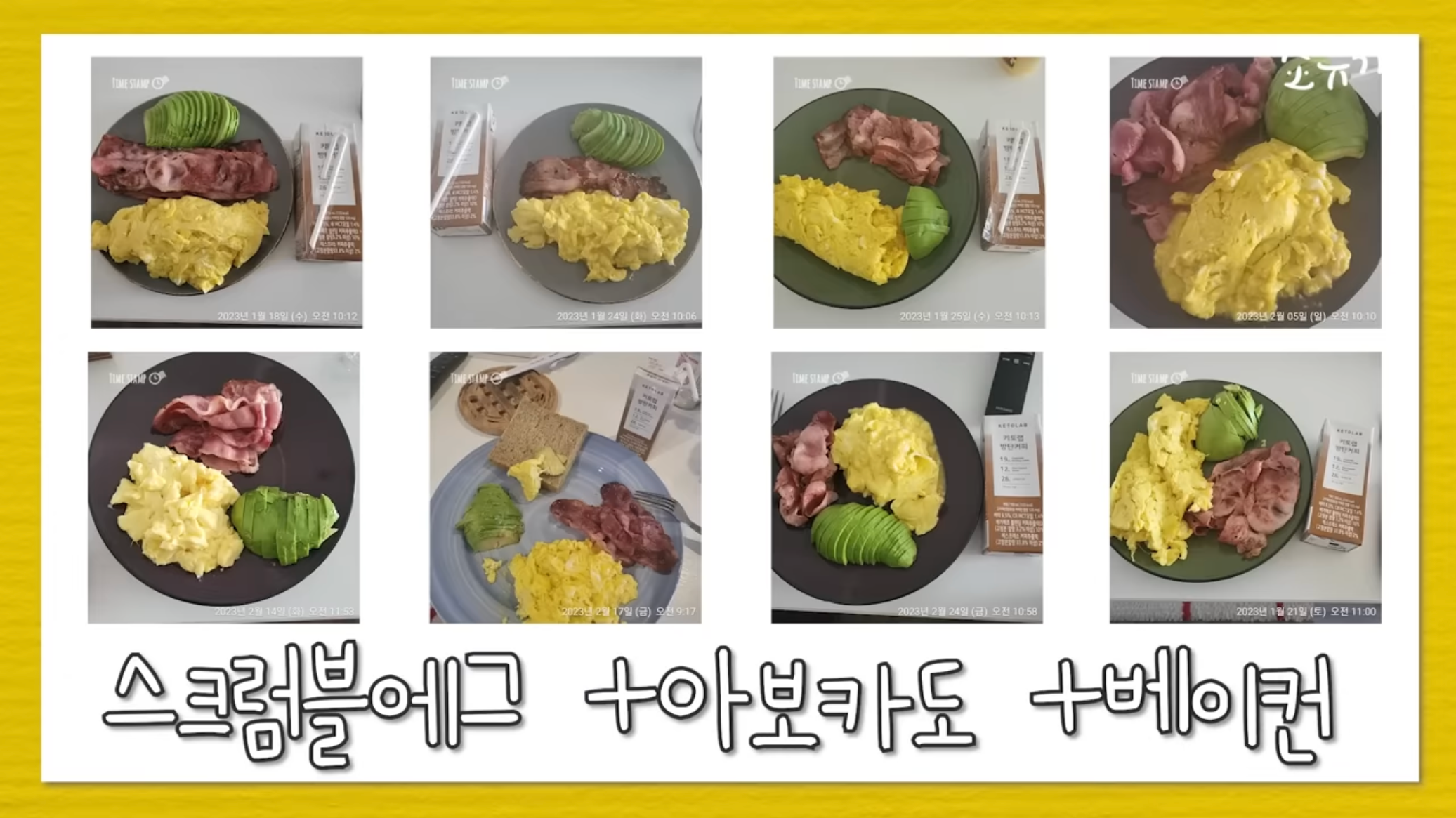아침은 주로 스크램블 에그와 아보카도, 베이컨으로 구성해 먹었고, 저녁은 닭다리살이나 삼겹살을 채소와 곁들여 먹었다고 한다. 그 외에도 자주 먹었던 것은 사골국과 미역국인데, 미역국에 소고기를 듬뿍 넣어서 먹거나 구매해 둔 도가니탕을 한 봉지 넣어서 먹으면 씹는 맛도 있고 좋았다고.