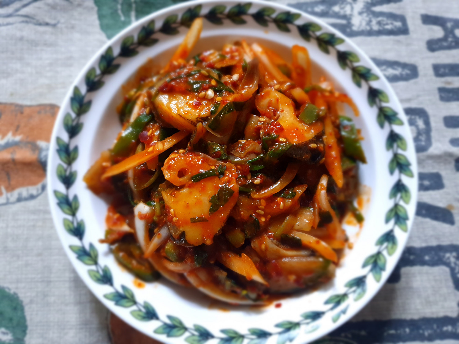 재료: 소라 500g, 다진 마늘 2큰술, 다진 파 2큰술, 고춧가루 1큰술, 고추장 1큰술, 간장 2큰술, 설탕 1큰, 식초 1큰술, 참기름 1큰술, 깨소금 약간, 맛살 (선택적으로 추가할 수 있음)